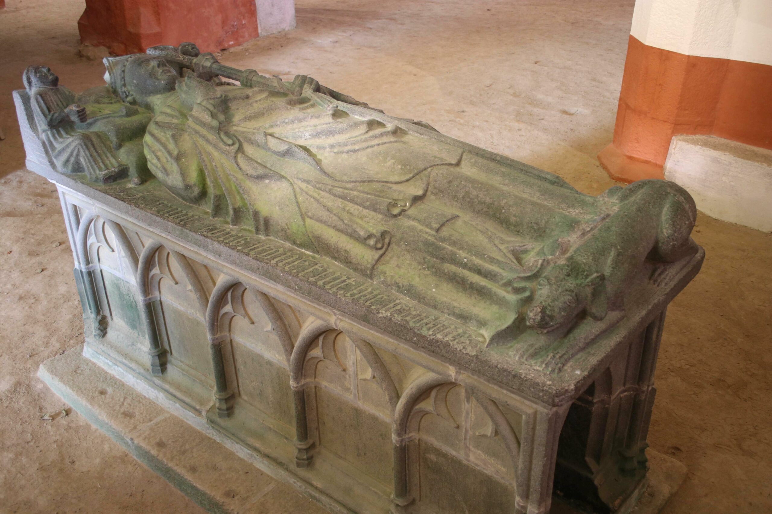 Le soubassement en pierre de Kersanton est décoré en son pourtour de fines arcades trilobées soutenues par de petites colonnes. Il ménage un étroit passage allant d’une extrémité à l’autre du monument funéraire.