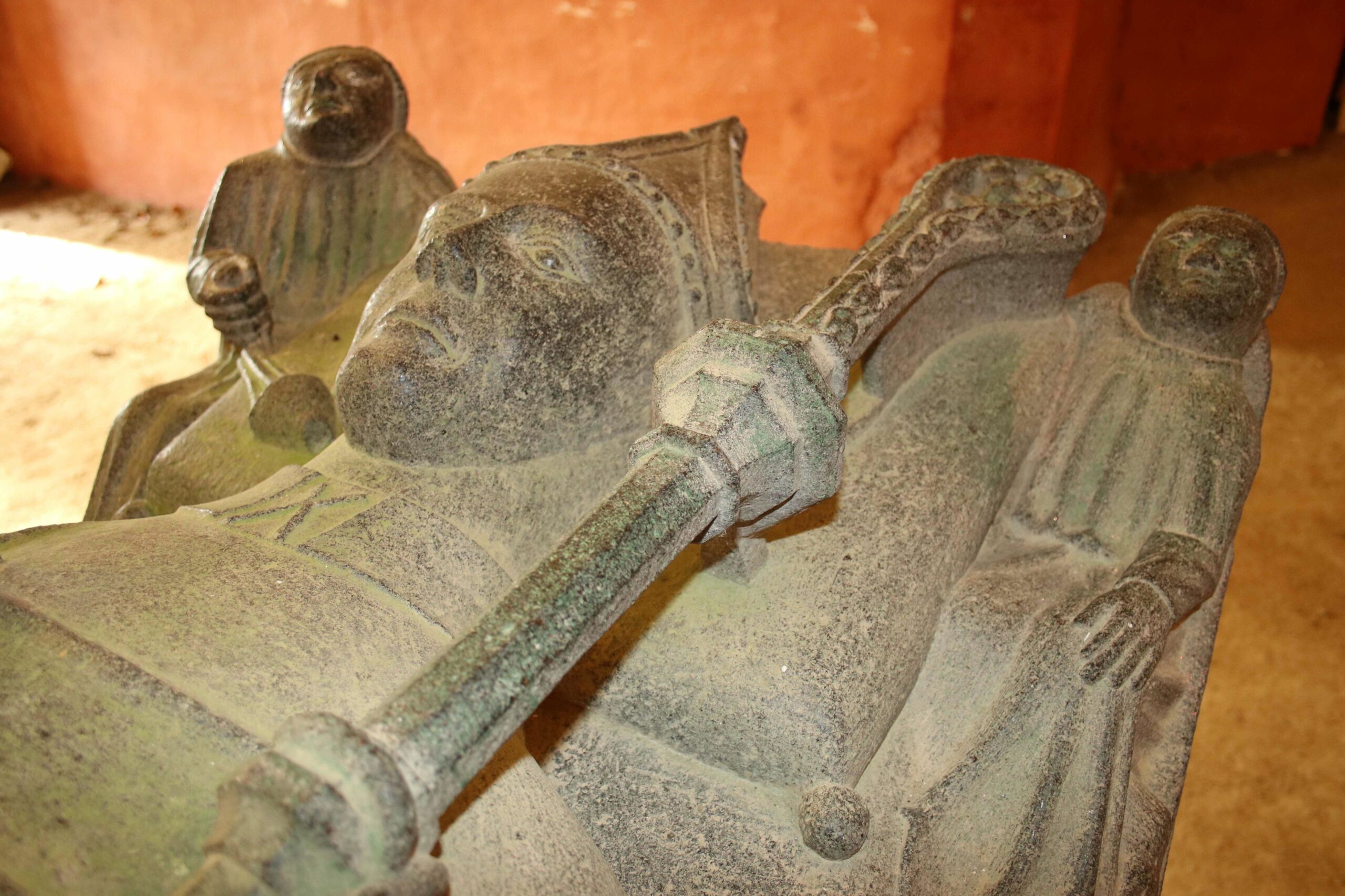 Sur les bords sud de la table, on lit facilement l’inscription suivante en caractères gothiques : « S. Joevin. épus. leonensis. fuit. huic. sepultus» : « Saint Joevin Evêque de Léon fut ici enseveli ».